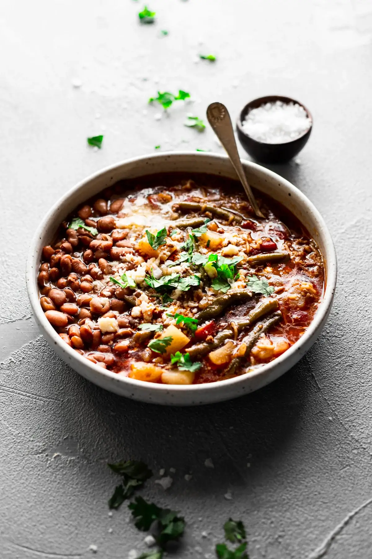 Pozole Poblano- pork soup with hominy and side of tostadas with beans, lettuce